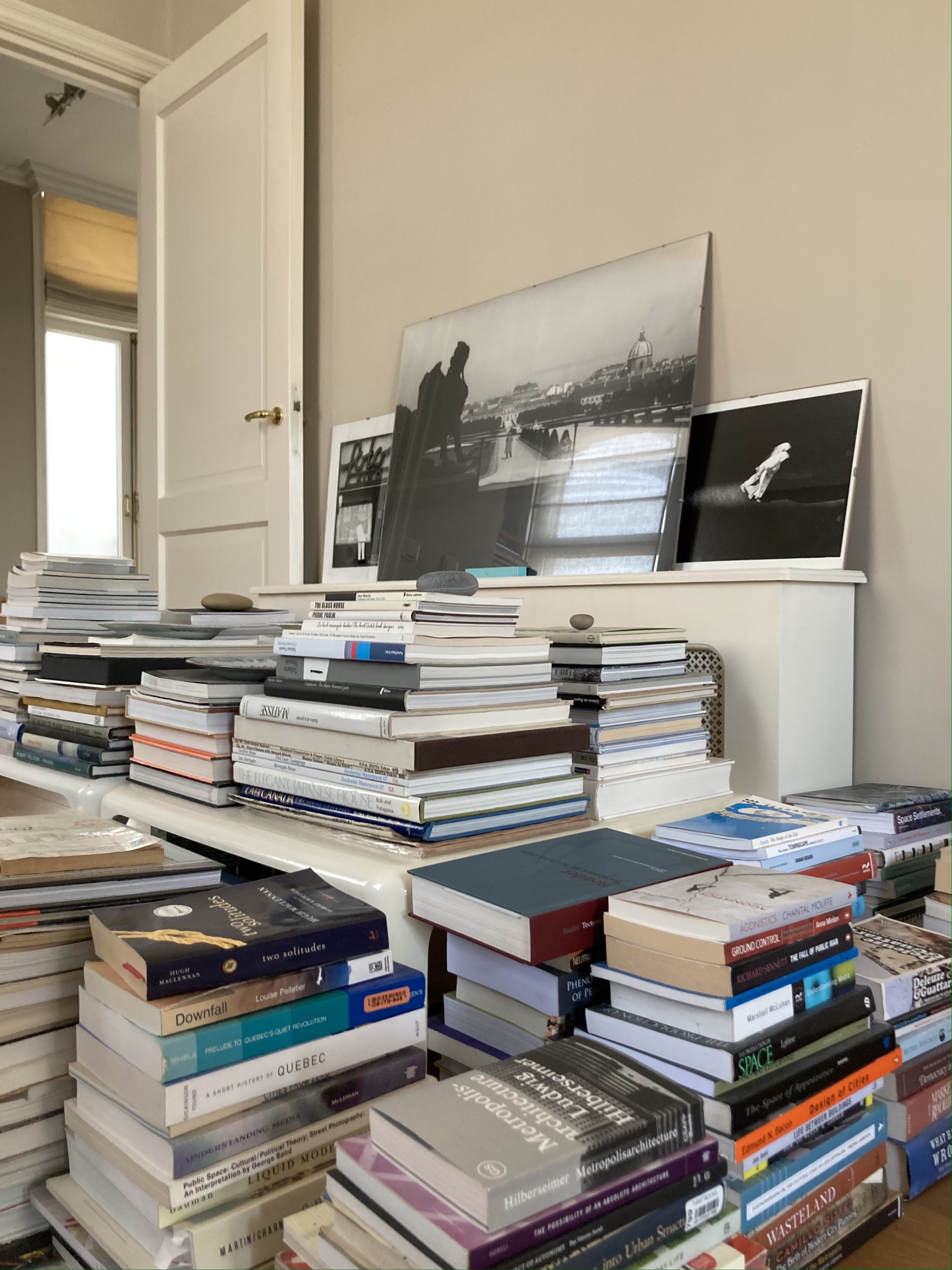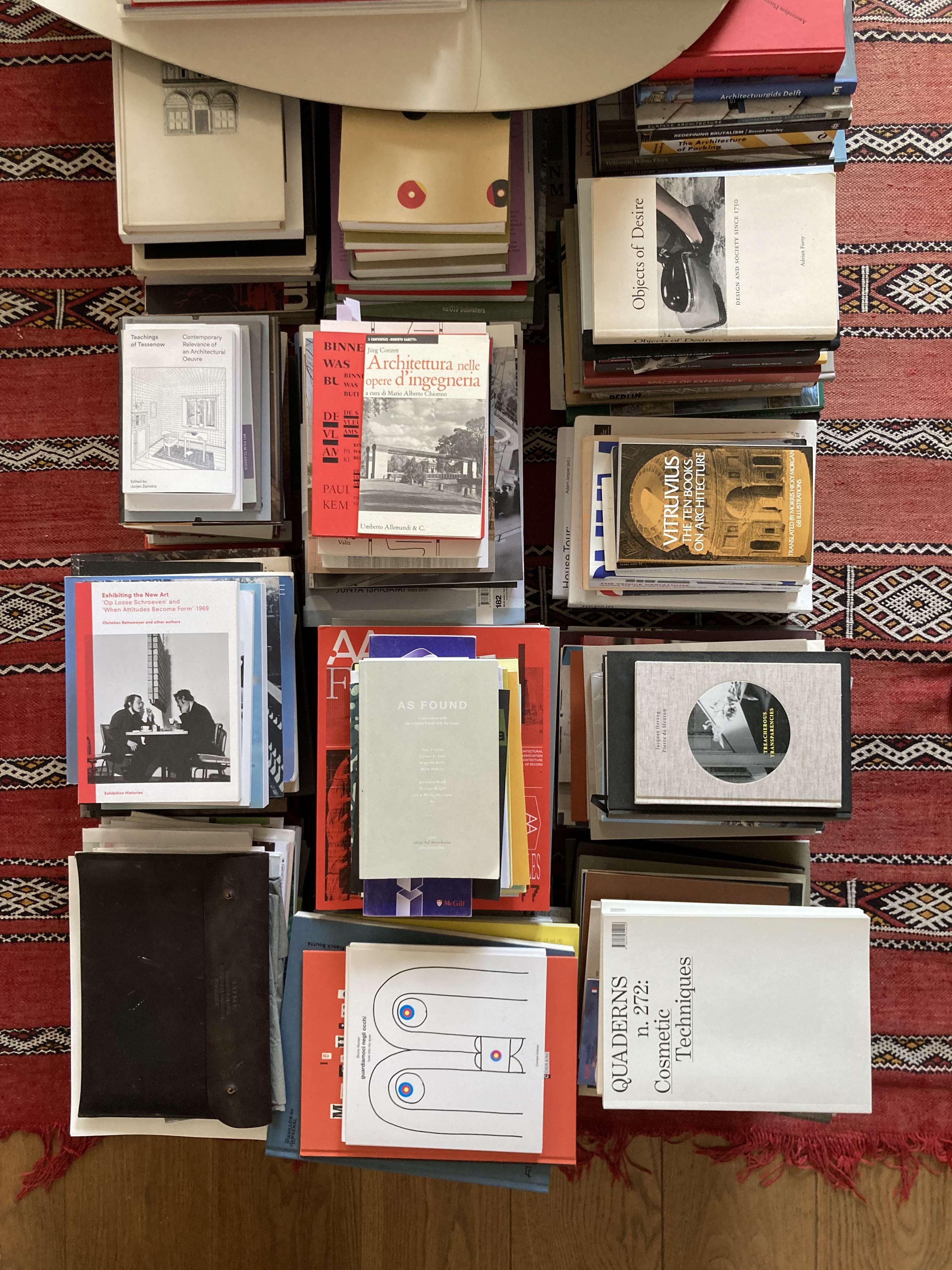 Well, they seem to have taken command of my apartment, and so are on bookshelves, on tables, in stacks on the floor, and everywhere. The bookshelves are by Vitsoe, originally from the Triangle Bookstore at the AA, bought from the dear and sadly departed Derek Brampton and his partner Alan Young. Derek was wonderful and had an extraordinary collection of things. Although not an architect himself, he was a natural painter and literature person, he had this way of guiding you to things and understanding your predilections, to stretch your imagination. A bookseller who in fact gets to know you and is engaged with you and your interests is wonderful. It is comforting to have those shelves, that piece of culture and memory of them with me all the time. Otherwise, the books, in their abundance, have migrated onto tables (Magistretti, Urquiola) and onto the floor, in lots of 30cm high stacks, a few stacks deep, resulting in some books being rather hard to find. They have become a landscape as well as an environment, I suppose. They are organised, if one can say that, roughly according to their subject, which may either be architecture, painting, sculpture, photography, film, philosophy, theory (art, architecture), or books on Venice, or gardens, or literature… The core of the library––its logic––stems from an arrangement of associated books that has survived moves within and from London to The Hague, undergoing another couple of variations.
